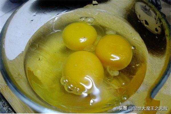 3个鸡蛋打入大碗中,蛋清蛋黄搅拌均匀蛋液中加入白糖,酵母粉,食盐再次搅拌均匀