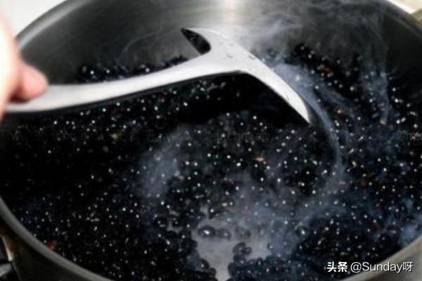 2、炒黑豆宜用炒菜锅,用文火,全过程轻拂大锅用铁铲拌炒(或抛锅),使每粒黑豆均值遇热,较不容易炒焦;如下图所示。