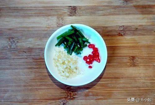 首先将大头菜先用手撕成小块(记住哦!是用手),然后将大蒜切成末、小葱切成段、辣椒切成圈备用!