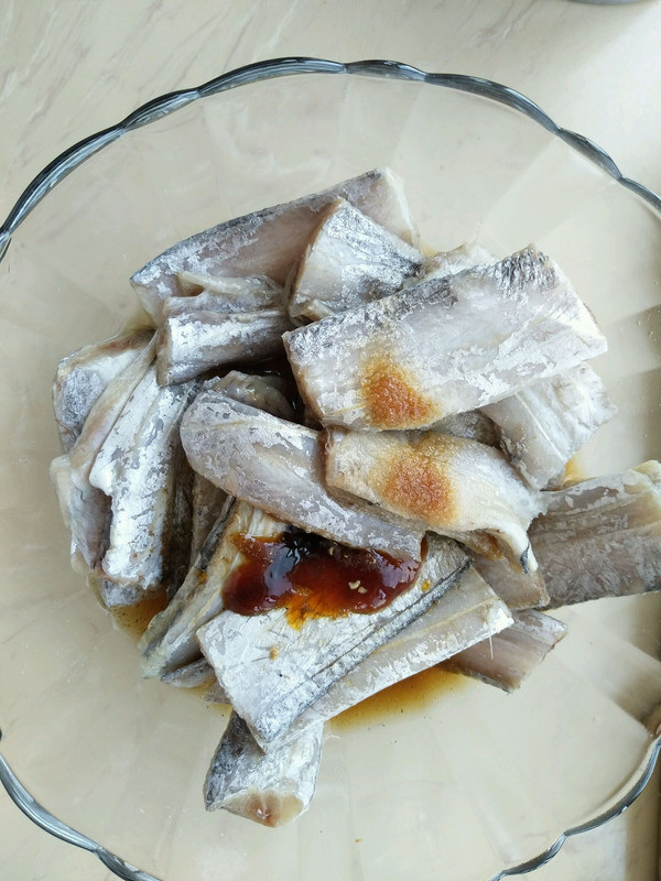 把所有调料和带鱼段放一个碗里,用手抓匀。