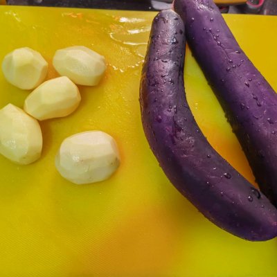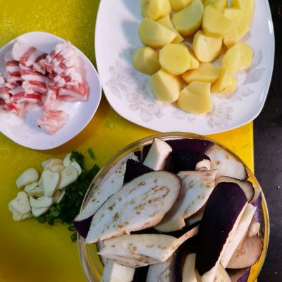 1准备两个土豆,三个茄子葱姜蒜少许。