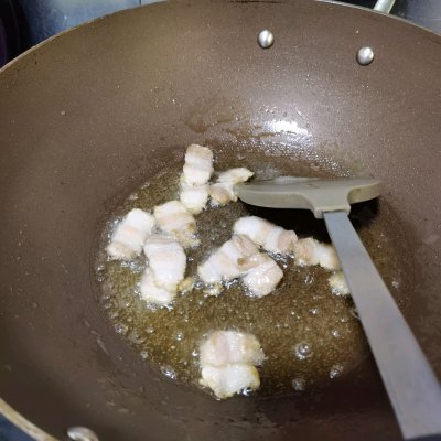 3、起锅烧油,五花肉放入锅中,炒至变色