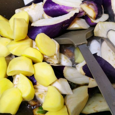 5、翻炒出香味之后,再把茄子,土豆放入锅中继续翻炒。