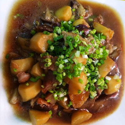 7、炖好之后撒点味精,盛出装在盘中,撒上切好的葱花即可食用了。