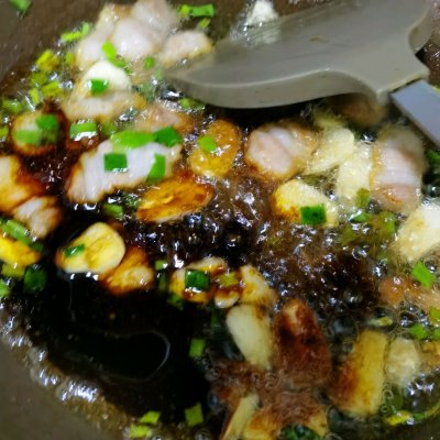4、五花肉炒至变色之后,加入葱蒜片,酱油,蚝油翻炒出香味