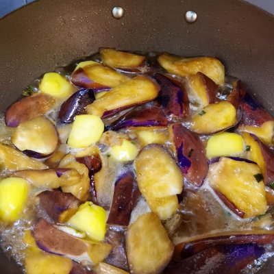 3.起锅烧油放入茄子炒软然后放土豆不断翻炒,加水中火开始炖,差不多时加入生抽蚝油盐味精葱段姜沫最后放上蒜沫即可。