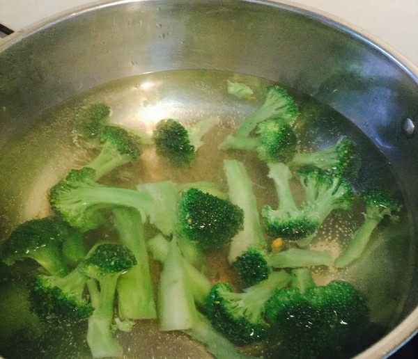 4 开水里加入少许的盐,放入西兰花焯水一分钟,放盐的目的是为了给西兰花增加底味