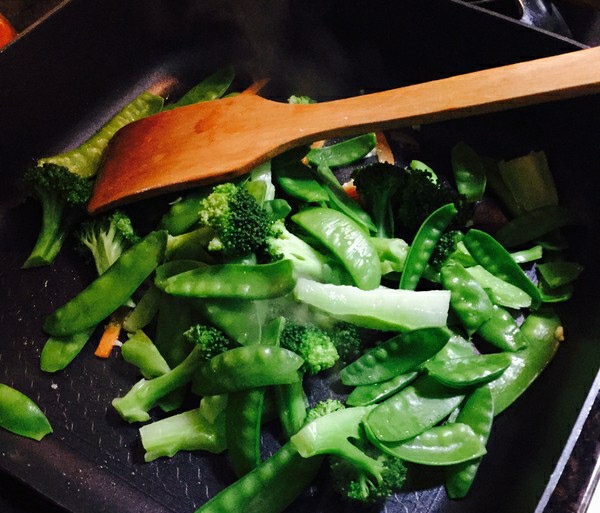 步骤8、加入焯好的西兰花和荷兰豆炒至熟