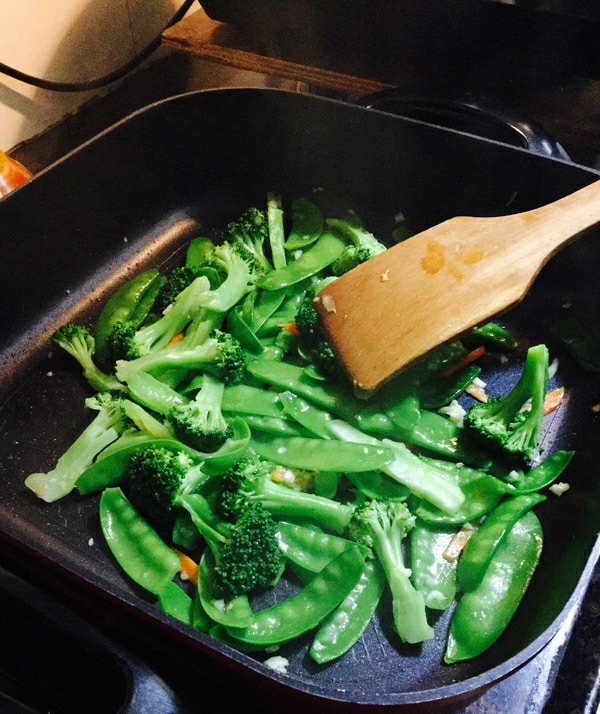 做法:1.荷兰豆和西兰花切好,择好备用 2.热锅起油,下荷兰豆略翻炒 3.下西兰花,翻炒 4.加生抽,至炒熟