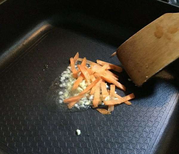 步骤1、准备好材料,荷兰豆撕去边,西兰花切小多,蒜子切成蒜末,胡萝卜切条