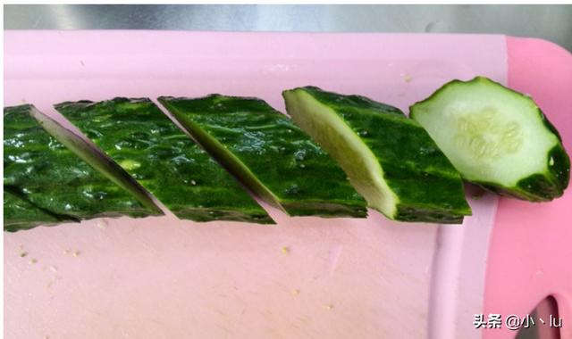 切成段的黄瓜切面朝下,切成薄片
