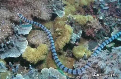 澳洲艾基特林海蛇 ,亦称"青环海蛇","斑海蛇",生活在热带海域地区,多在澳大利亚海湾浅水带。它长着一张大嘴,其躯干略呈圆筒形,体细长,后端及尾侧扁平。它的毒性比眼镜王蛇还要大,如果被它咬一口,数十分钟内就会死亡。在世界上十大毒蛇排行榜上排名第2。艾基特林海蛇与箱水母居住于同一个海域。要知道箱水母可是世界上最致命的水母,没有之一。箱水母的毒性可以说人只要触碰就会死亡。而艾基特林海蛇能与箱水母共同生活在一片海域里,可见其毒性之强大。