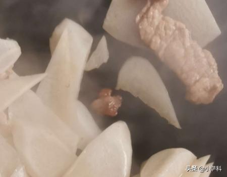 2、热锅放油,放少许肥肉炸出油,放入腌好的瘦肉翻炒变色。3、放入萝卜片翻炒至软,加入一勺盐翻炒,加少许热水焖煮几分钟即可。