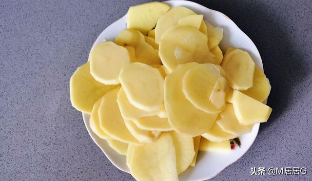 2.土豆切片,用水多冲洗几遍,洗掉表面多余的淀粉。