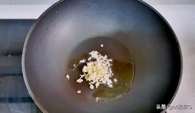 6.放3勺食用油,放蒜末炒香。