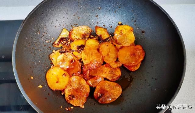 9.倒入土豆片翻拌均匀,可加1勺白糖调味。