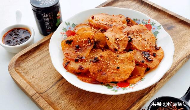 土豆中含有丰富的膳食纤维,有助促进胃肠蠕动,疏通肠道。土豆具有抗衰老的功效。它含有丰富的维生素B1、B2、B6和泛酸等B族维生素及大量的优质纤维素,还含有微量元素、氨基酸、蛋白质、脂肪和优质淀粉等营养元素。土豆是碳水化合物,但是其含量仅是同等重量大米的1/4左右。土豆是非常好的高钾低钠食品,很适合水肿型肥胖者食用,加上其钾含量丰富,几乎是蔬菜中最高的,所以还具有瘦腿的功效。今天,和大家分享一款超好吃的土豆片做法~麻辣土豆片,超简单的做法。