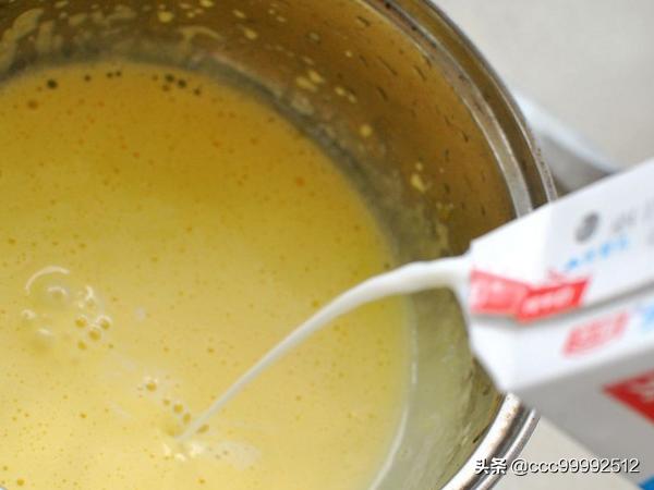 2、然后把牛奶倒入蛋黄糊里,搅拌均匀,再放入奶锅里用小火加热,具体如下图所示。