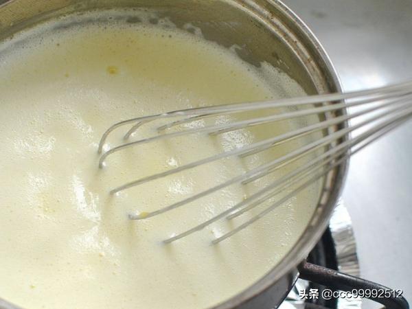 ?3. 蛋黄浆里加入热牛奶烧开离火冷却,煮时要不停搅拌防止粘锅。