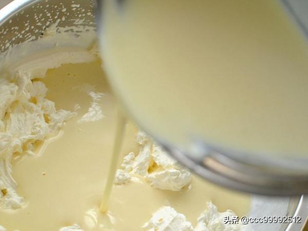 ?5. 加入冷却的牛奶糊继续打发。
