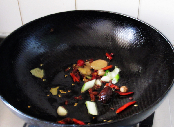然后再放入花椒15克,干辣椒十克,葱花15克,香叶五克,炒出香味。