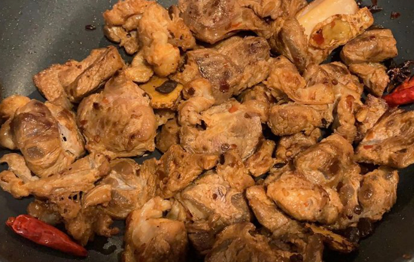 接着把牛腩500克放入其中,煸炒两分钟。
