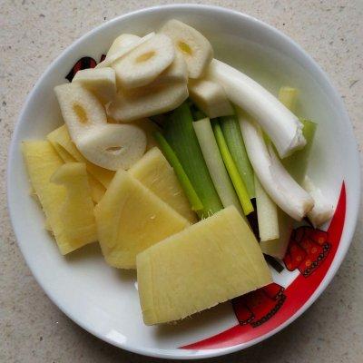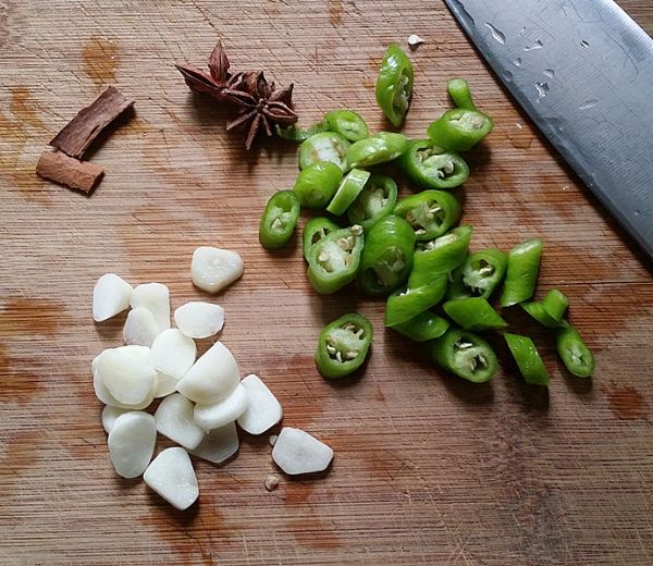 备好葱姜、桂皮、八角,另将杭椒、蒜头切片