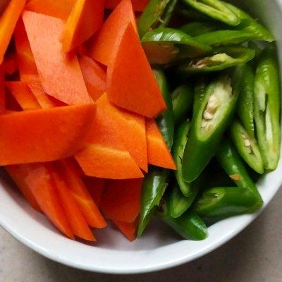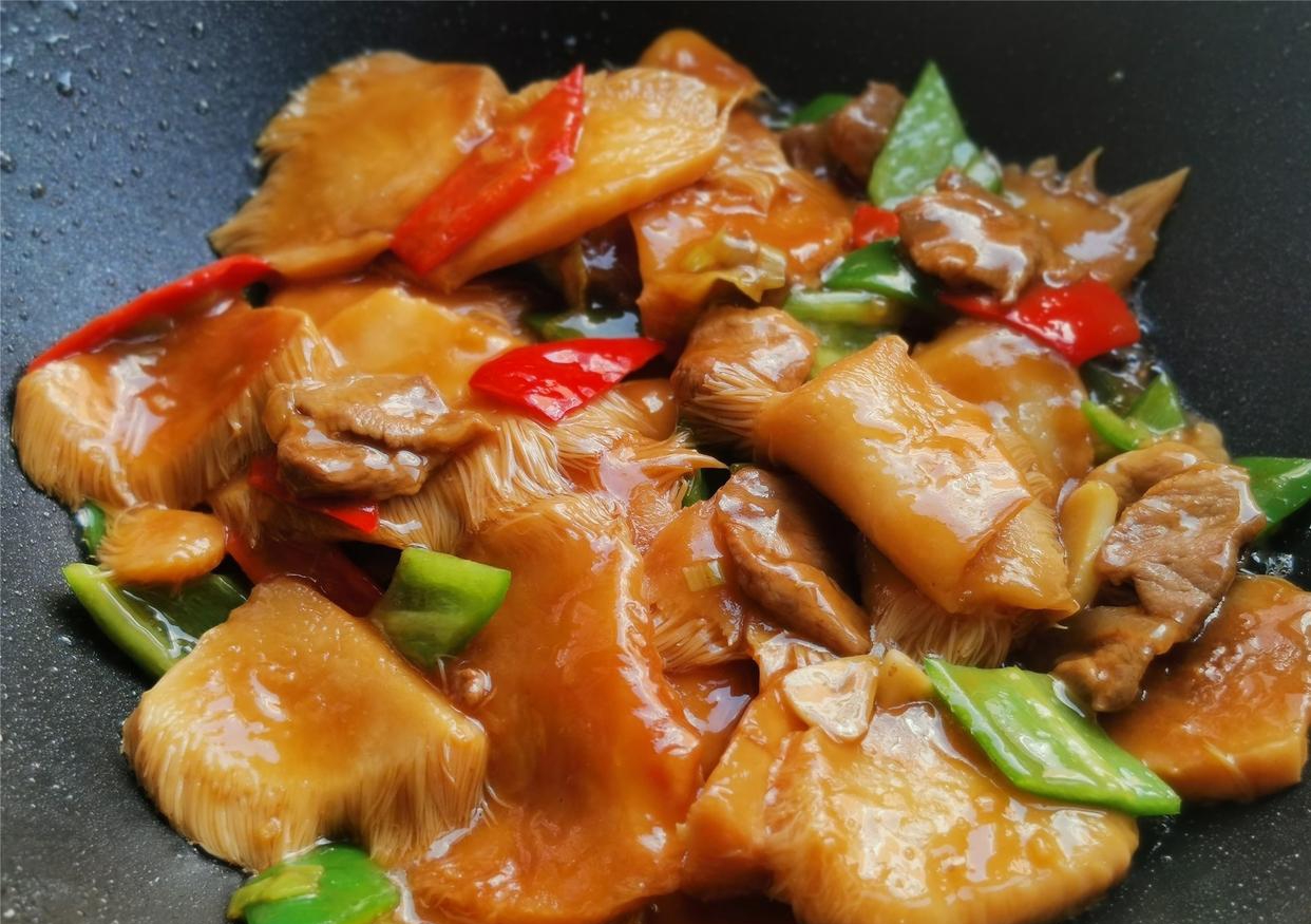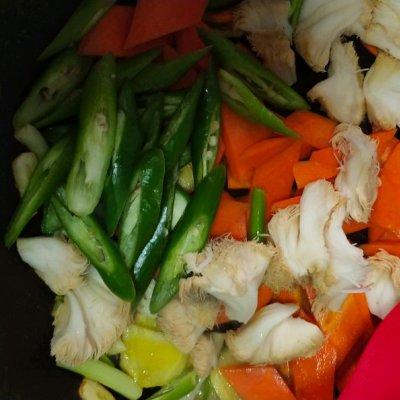 等卤汁快干时倒入蒜片和杭椒炒匀