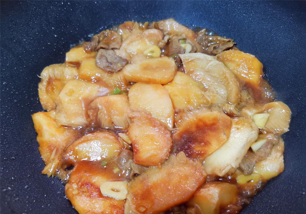 下入猴头菇,加盐、生抽、红烧酱油,大火烧开转小火烧4分钟