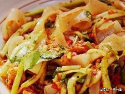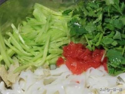 3、黄瓜切丝、半个西红柿切碎、香菜切断,跟凉皮一起放入大点的碗里。