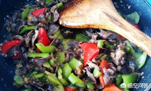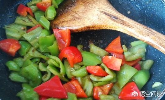 7、锅里放入植物油,放入尖椒和红椒爆炒,加入食盐炒入味。