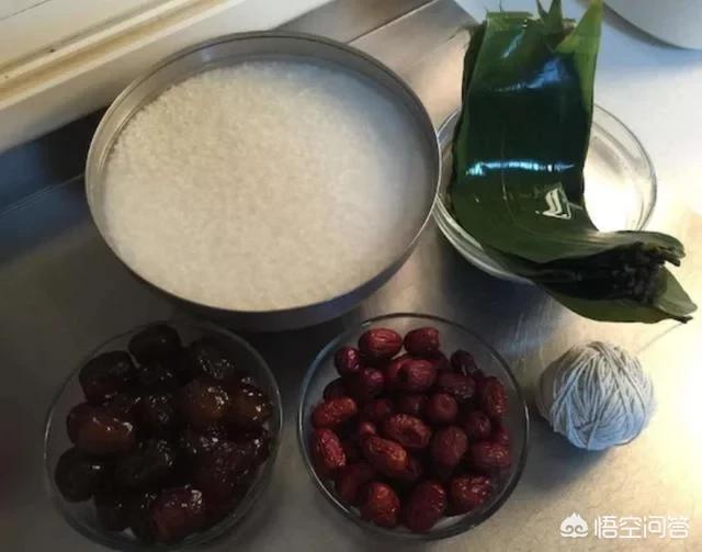 1、糯米、粽叶、马蹄莲(包粽子用的绳)、甜 枣、花生