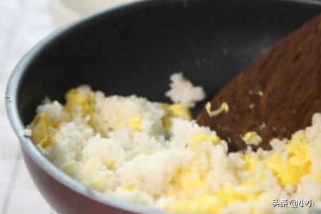 5、倒入蛋液翻炒,炒到半熟,加入米饭翻炒。