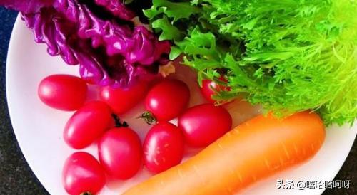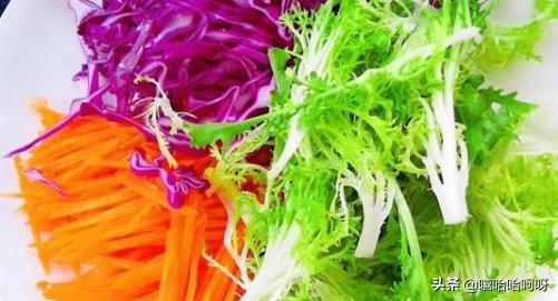 原料:苦菊、紫甘蓝、胡萝卜、番茄、白糖、白醋、盐。