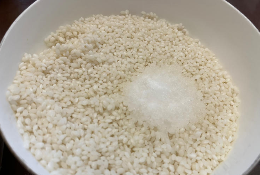 准备一个干净的盆子,里面放入糯米500克,白糖150克。