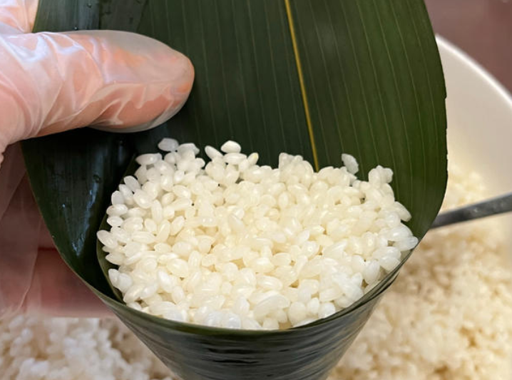 接着拿出一张粽叶15克,折叠成漏斗状,里面放入糯米馅料35克。