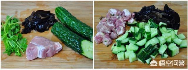 1.将洗净的黄瓜、猪肉、木耳切成小块。