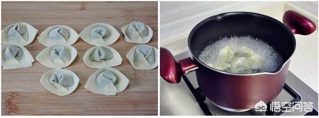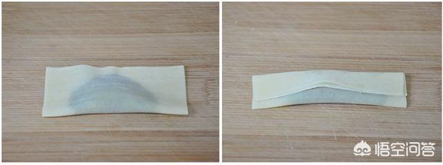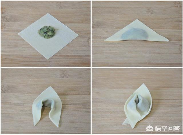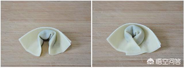 馄饨跟饺子的包法不一样:两边对折,不用捏褶,平着将两个角捏合在一起即可。