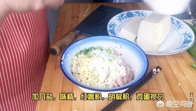 往肉沫里面一次添加:豆腐沫、葱沫、姜沫、盐、味精、红薯粉、鸡蛋、胡椒粉