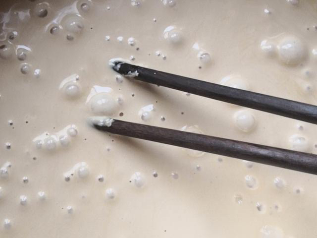 把剩下的排骨汤加热成滚烫滚烫的汤,最好两个人同时进行,一个人用勺子往淀粉里泼热汤,另一个人快速的搅拌均匀,汤一点点加入。