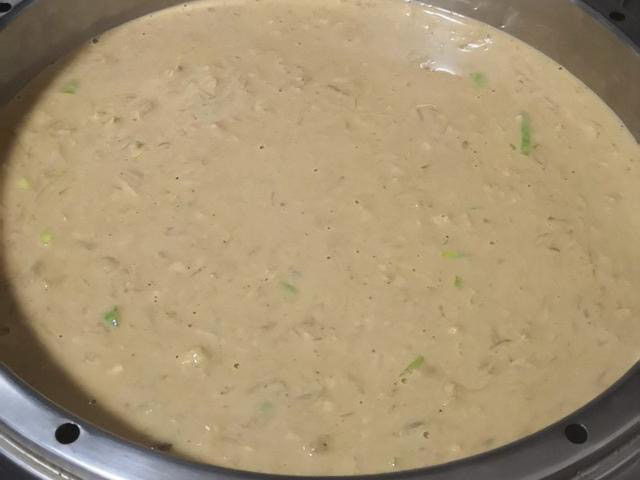 搅拌均匀后,放入深容器里盛放。或者不锈钢盆里,容器底部抹油,脱模时好出来。不要太厚,不然蒸的时间太长。