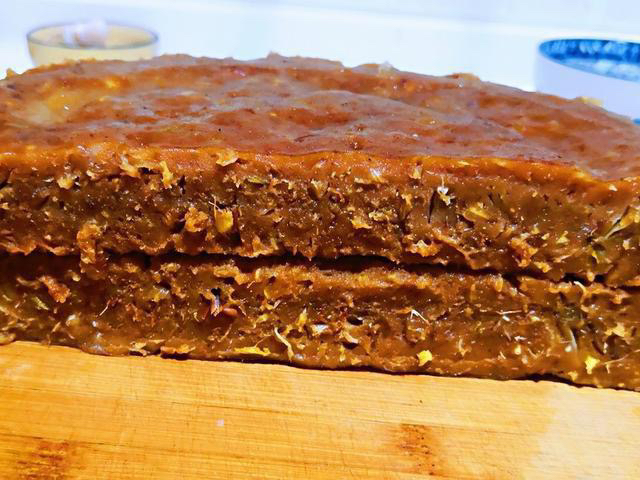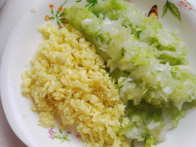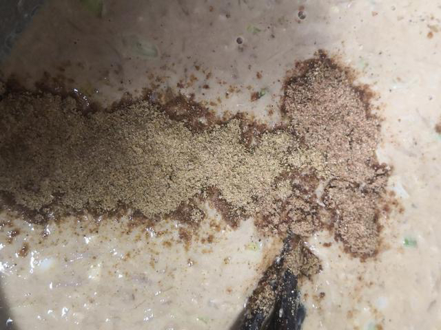 汤加完后,放入肉丝,十三香,葱末,姜末,香油,食盐。盐少放点,因为肉汤本身有盐味。再放入一个生鸡蛋,是它蒸出来宣软。 我的失败之处是加了老抽,导致肉焖子蒸熟后颜色发深。所以,以后不加酱油。