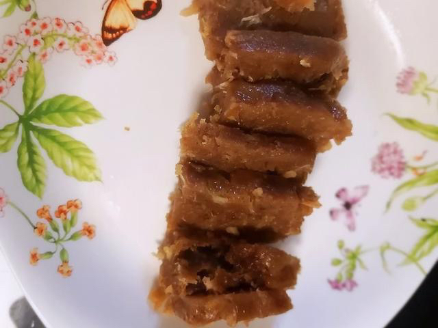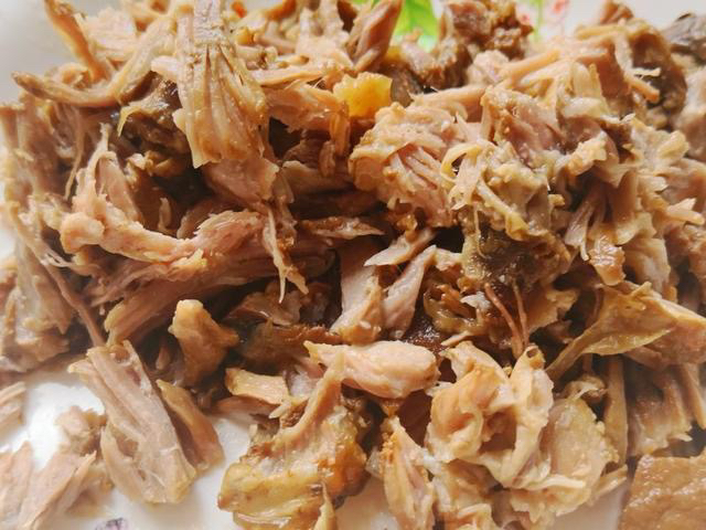切开,肉丝和葱姜都可看到。味道是又筋道又香。
