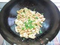 4.20分钟后,倒入腐竹和鸡蛋块,搅拌均匀后盖上锅盖再焖10分钟,10分钟后打开盖子,来一点糖和盐调味,撒入剩余葱段,翻拌均匀即可关火盛出。