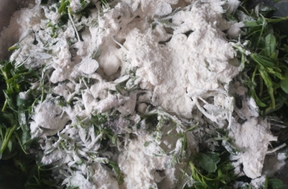 2. 在面粉中加入适量的水,搅拌成面团,然后加入苜蓿菜碎和食盐,继续搅拌均匀。