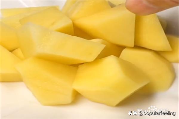 5.土豆去皮洗净,切滚刀块,然后把土豆放入盘子里。