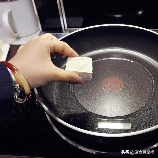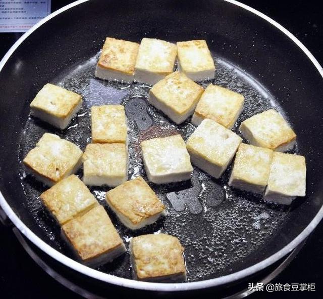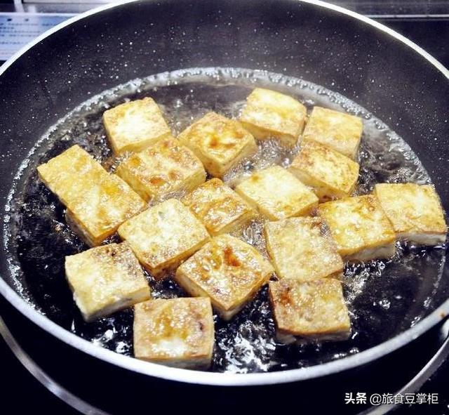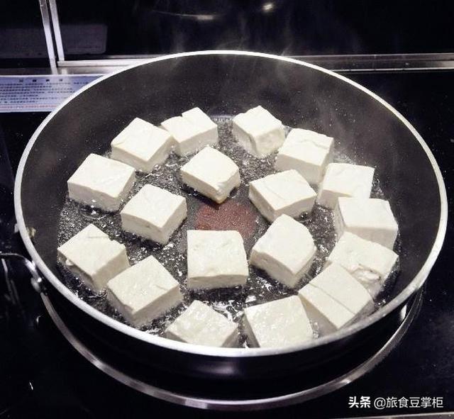 做法:1.豆腐切成小方块,平底锅烧热倒入稍多一些的油,摆入豆腐块煎,煎至一面金黄,翻面煎另一面。