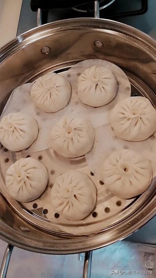 第三点,包子包完后要进行二次醒发,天气热就在室温下醒发,天气冷的话要放到温暖的地方醒发到包子胀大一圈,就可以上锅蒸了,冷水上锅,水开后转大火蒸12分钟左右。熟后关火焖3分钟,以免包子热胀冷缩塌皮了。