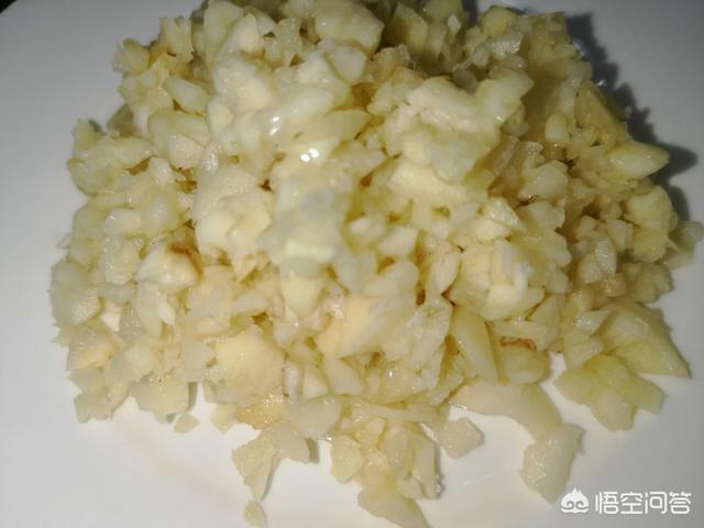 2:起火烧油,放入剁好的蒜蓉煸香,加入盐2g,鸡汁2g,白糖2g,鸡粉2g,煸炒几下,然后倒出来备用。