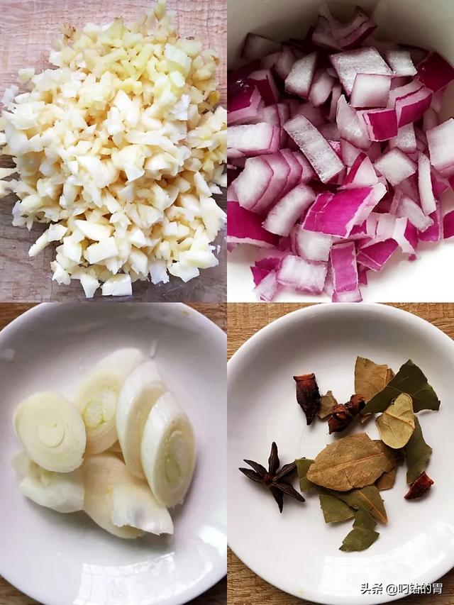 3?剁蒜蓉、生姜,将洋葱切小粒,大葱切片,备好八角、桂皮、香叶。